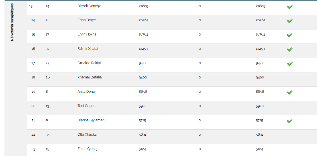 Shumë emra të njohur të Partisë Socialiste janë në rrezik të mos jenë pjesë e legjislaturës së re. Pandeli Majko, që deri tani ka marrë vetëm 4300 vota, ka mbetur jashtë. Po ashtu edhe figura si Etilda Gjonaj, Mimi Kodheli, Ermonela Felaj, Klotilda Bushka, Toni Gogu, Arben Pëllumbi dhe Plarent Ndreca pritet të mos jenë në Kuvend.