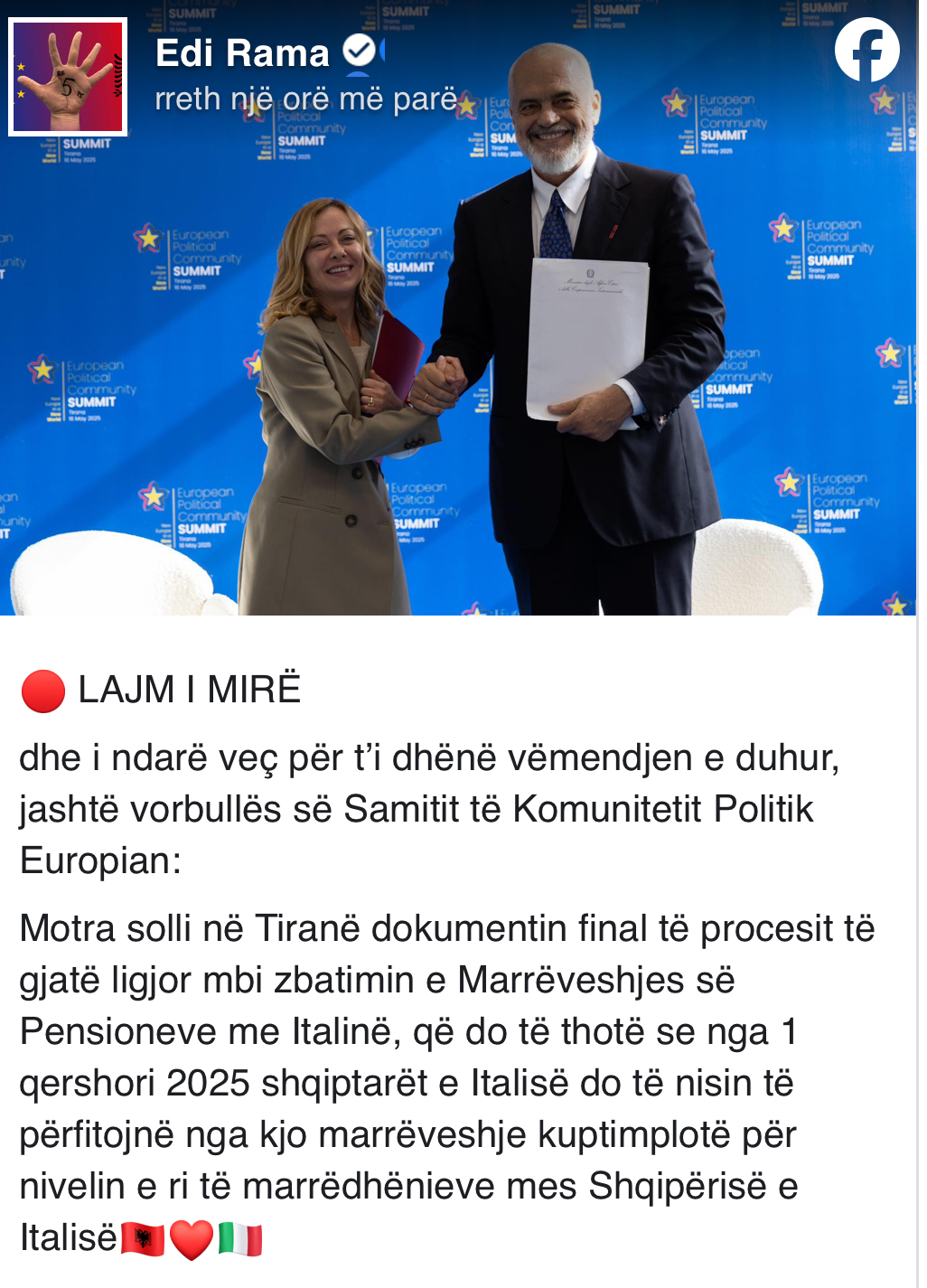 Marrëveshja e pensioneve me Italinë/ Kryeministri Rama jep datën zyrtare mbi zbatimin e pensioneve: Nga data…