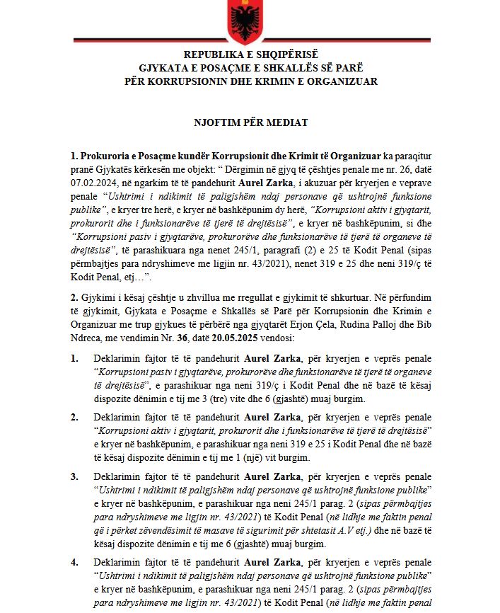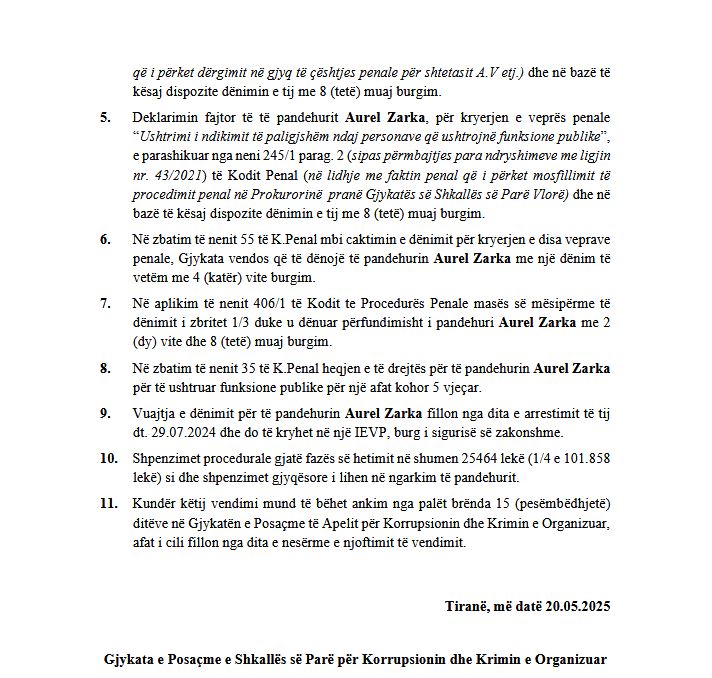 Gjithashtu, Aurel Zarka nuk mujnd të ushtrojë funksione publike për së paku pesë vite. SPAK kishte kërkuar që Zarka të dënohej me 6.4 vite burgim.