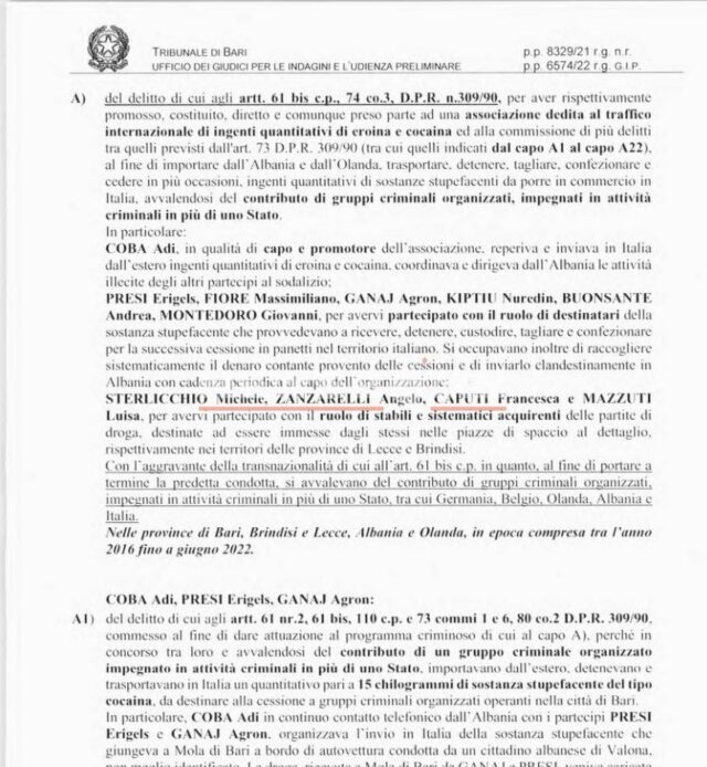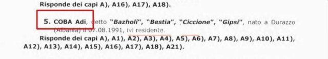 “COBA Adi, si drejtues dhe promotor i shoqatës, gjeti dhe e dërgoi në Itali sasi të mëdha heroine dhe kokaine nga jashtë. I koordinonte dhe drejtonte aktivitetet nga Shqipëria”, thuhet në dosjen italiane.