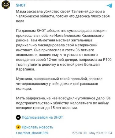 Gruaja 46-vjeçare, e identifikuar si Svetlana, i ofroi 1,100 euro një të njohuri për të mbytur vajzën në një lumë në rajonin e Chelyabinsk. Ajo justifikoi veprimin duke thënë se ishte “e lodhur” nga sjellja e fëmijës dhe konfliktet e shpeshta mes tyre.Burri që do kryente ‘porosinë’, 36-vjeçari, me emrin Andrei, e tradhtoi nënën. Ai i tregoi të miturës të gjithë planin dhe më pas e ndihmoi të fshihej, duke informuar menjëherë autoritetet.