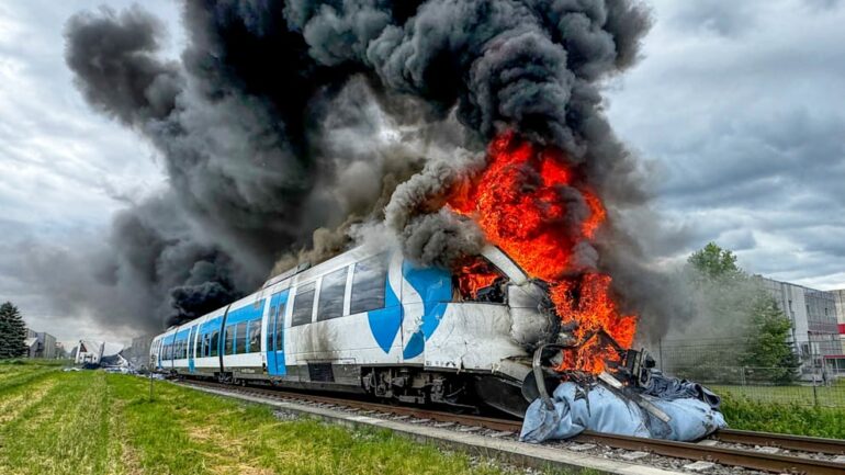 Aksident tragjik në Austri/ Kamioni përplaset me trenin dhe shpërthen në zjarr, 16 persona të plagosur