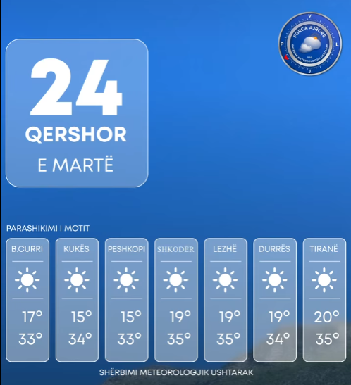 Temperaturat minimale do të jenë 15 gradë Celsius, ndërsa maksimale 36 gradë.