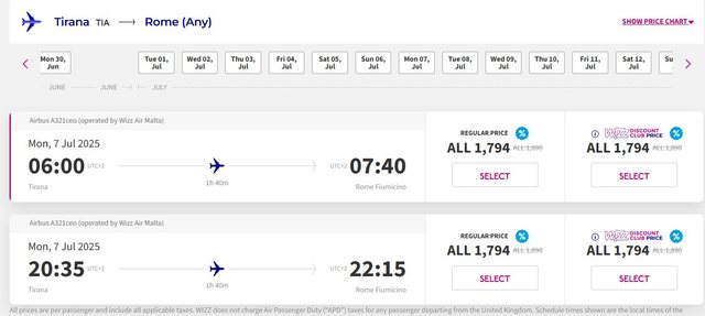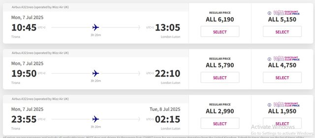 Konkretisht, për efekt të këtij vëzhgimi, ne vendosëm si datë nisje 7 korrik 2025 dhe testuam destinacionet kryesore, Angli dhe Itali, për opsionet e orareve të fluturimit dhe cmimin e biletave.