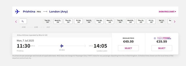 I njëjti destinacion me Londrën, nga aeroporti i Prishtinës, në të njëjtën datë, është me vetëm një opsion:Nisje në ora 11.30, me cmim 39,99 euro.