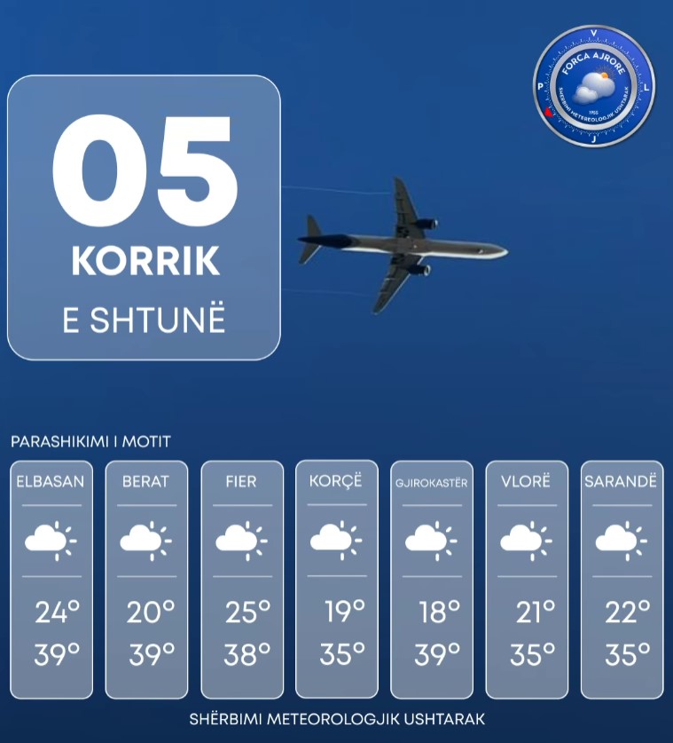 Sipas Shërbimit Meteorologjik Ushtarak (SHMU), ditën e shtunë, më 5 korrik, vendi ynë do të ndikohet nga kushte atmosferike të qëndrueshme dhe me temperatura të larta.