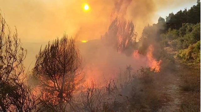 Në Vlorë, flakët po përhapen pranë Parkut Natyror të Syrit të Kaltër dhe në zonat e Pecës, Kardhikaqit dhe Sirakatit.