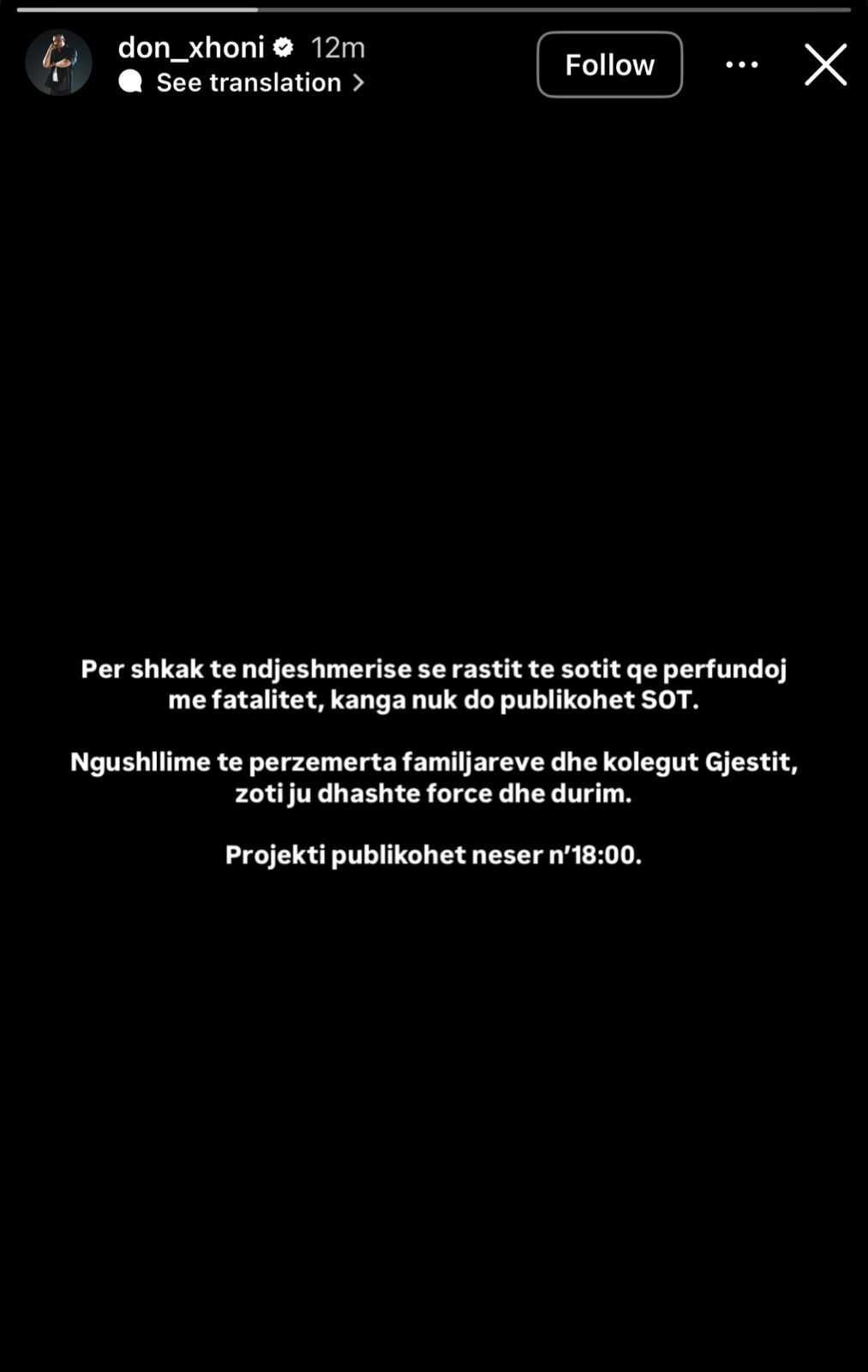 Për shkak të ndjeshmërisë së rastit të sotëm që përfundoi me fatalitet, kënga nuk do publikohet sot. Ngushëllime të përzemërta familjarëve dhe kolegut Gjestit. Zoti ju dhëntë forcë dhe durim.