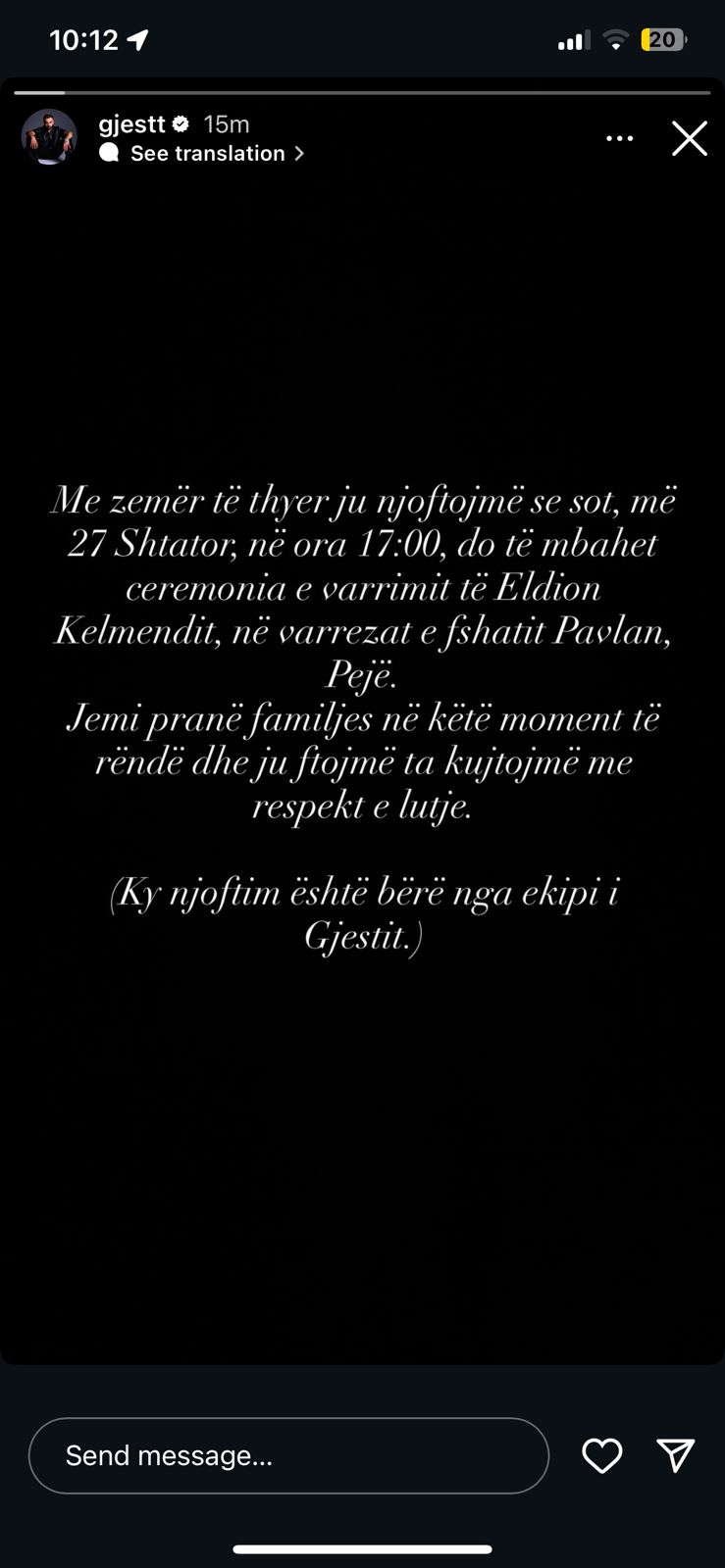 “Me zemër të thyer ju njoftojmë se sot, më 27 Shtator, në ora 17:00, do të mbahet ceremonia e varrimit të Eldion Kelmendit, në varrezat e fshatit Pavlan, Pejë. Jemi pranë familjes në këtë moment të rëndë dhe ju ftojmë ta kujtojmë me respekt e lutje. (Ky njoftim është bërë nga ekipi i Gjestit.)”, shkruhet në postim.