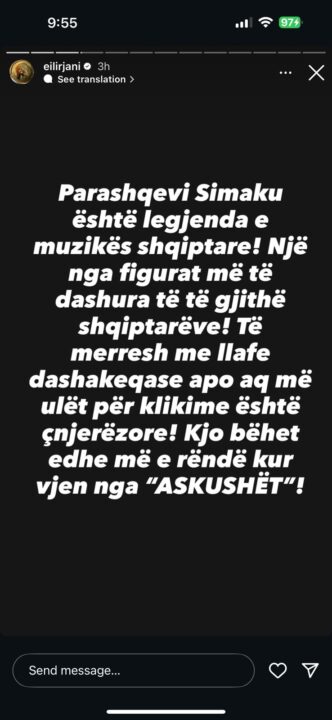 “Parashqevi Simaku është legjenda e muzikës shqiptare! Një nga figurat më të dashura të të gjithë shqiptarëve! Të merresh me llafe dashakeqëse apo aq më ulët për klikime është çnjerëzore! Kjo bëhet edhe më e rëndë kur vjen nga “ASKUSHËT”, ka shkruar Eltoni në një postim në “Instastory”.