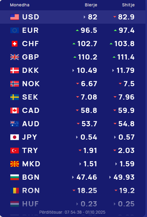 Ndërsa paundi britanik do blihet me 110.2 lekë dhe do shitet me 111.4 lekë.