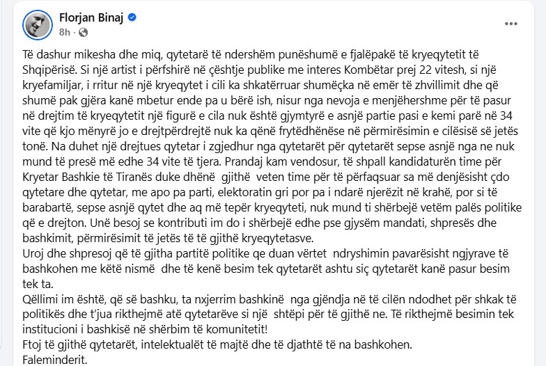 “Na duhet një drejtues qytetar, i zgjedhur nga qytetarët, për qytetarët. Asnjë nga ne nuk mund të presë edhe 34 vite të tjera për të parë ndryshimin,” shprehet Binaj në mesazhin e tij.