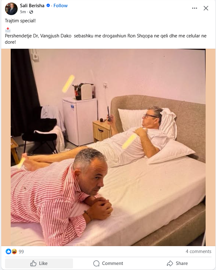 Pak ditë më parë, kreu i PD-së, Sali Berisha publikoi një foto të Vangjush Dakos në qeli me celular, sic tha ai “me drogaxhiun Ron Shqopa”. Por më pas atë foto e fshiu nga rrjetet sociale.