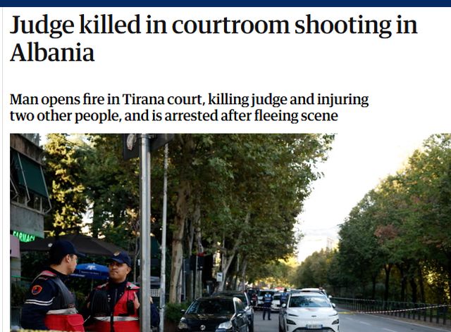 The Guardian e ka nisur artikullin duke shkruar se ‘Një burrë në gjyq hapi zjarr në një sallë gjyqi në kryeqytetin e Shqipërisë, Tiranë, të hënën, duke vrarë gjyqtarin dhe duke plagosur dy persona të tjerë, tha policia. Personi i armatosur iku nga vendi i ngjarjes, por u arrestua më vonë. Gjyqtari Astrit Kalaja u qëllua brenda sallës së gjyqit nga një i dyshuar 30-vjeçar me inicialet E Sh, sipas policisë. Kalaja vdiq ndërsa po dërgohej në spital.’ Artikulli vazhdon më tej duke sqaruar ngjarjen dhe arrestimin e autorit.