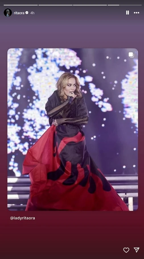 Në një postim në InstaStory, këngëtarja me origjinë shqiptare ka ndarë një fotografi nga një performancë e saj, ku mban të veshur një kostum të zi e mbështjellë me flamurin shqiptar.