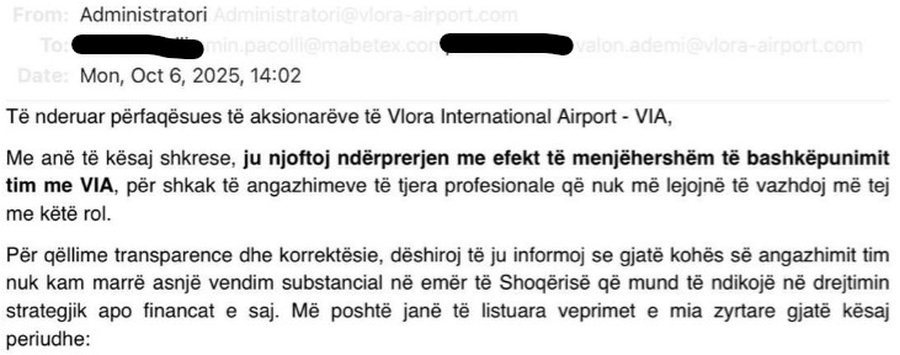 Një javë më parë, Mentor Hajdaraj ka dhënë dorëheqjen e parevokueshme nga posti i administratorit të kompanisë VIA, e cila menaxhon projektin strategjik të Aeroportit Ndërkombëtar të Vlorës.