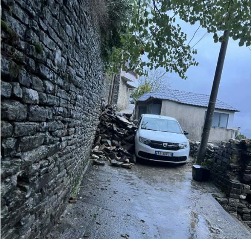 Një mur anësor është shembur në lagjen “Pazari i Vjetër” në qytetin e Gjirokastrës, duke shkaktuar bllokimin e rrugës dhe dëmtimin e një automjeti të parkuar pranë vendngjarjes.
