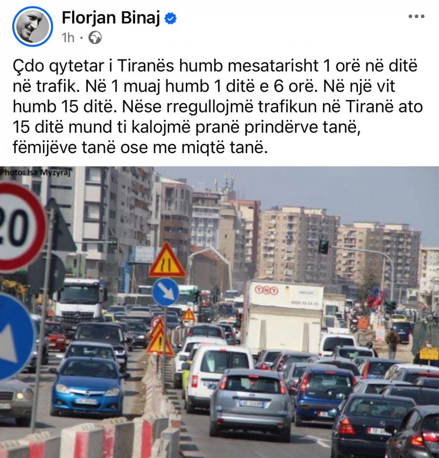 Përmes një postimi në rrjetet sociale, Binaj shprehet se trafiku në Tiranë i bën qytetarët të humbasin 15 ditë në vit.