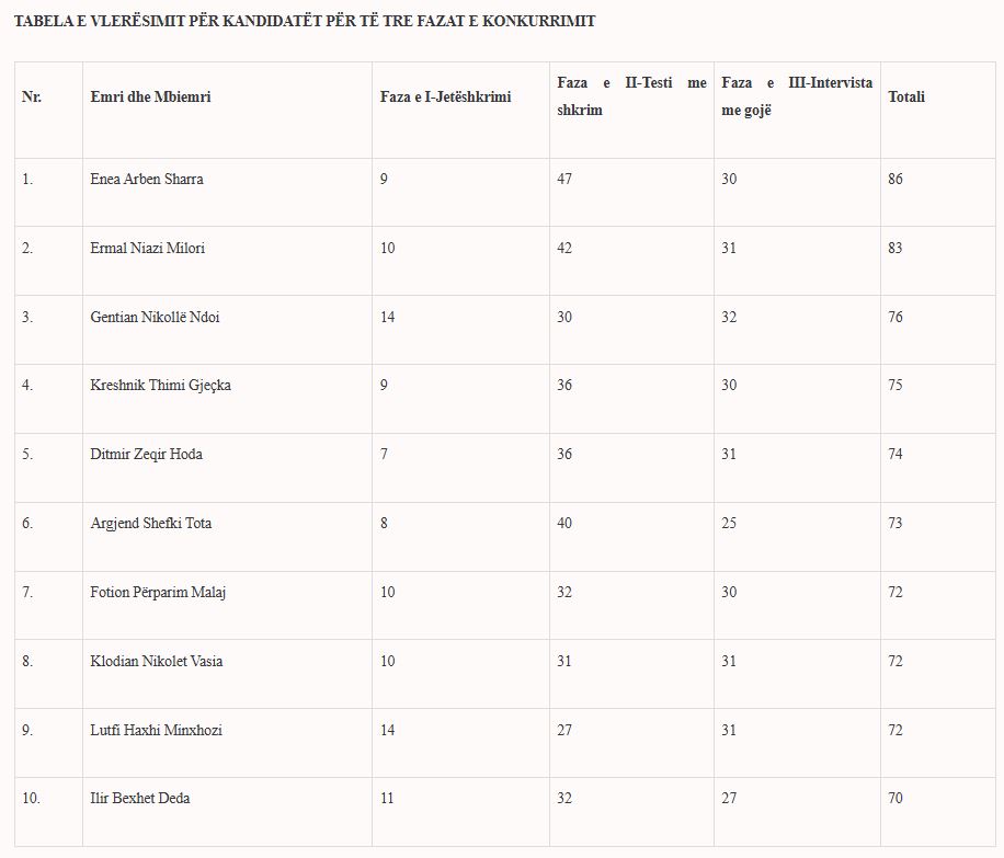 Më datë 24.10.2025, Komisioni i Përzgjedhjes bëri pikëzimin përfundimtar të tre fazave dhe hartoi listën me renditjen e kandidatëve duke filluar nga kandidati me rezultatin më të lartë, të pasqyruar në tabelën e mëposhtme: