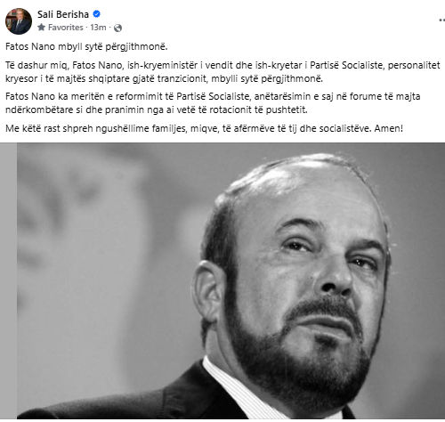 Kreu i Partisë Demokratike, Sali Berisha, ka reaguar me një status në Facebook pas ndarjes nga jeta të Fatos Nanos ditën e sotme.