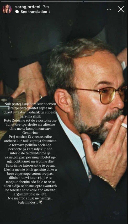 Ulesha me një bllok që ishte duke u bërë copë-copë, vetëm, pasi dilnin intervistat e tij, për të mbajtur shënim çdo fjalë të re të cilën e dija se do më jepte avantazh në bisedat në shkollë apo aftësitë argumentuese në jetë. Një mentor i huaj në heshtje. Faleminderit!”-shkruan Gjordeni në Instagram.