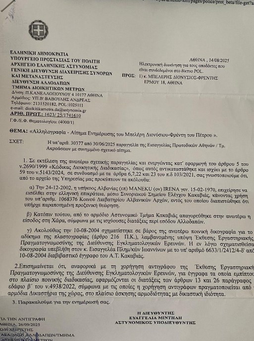 Institucionet e kapura të KLGJ, SPAK, ILD nuk veprojnë për këtë krim flagrant. Sot paraqes provën e re, vërtetimin e lëshuar nga drejtoria e policisë së Greqisë, ku vërtetohet ekspulsi nga territori grek, si pasojë e hyrjes në territorin grek me vizë të falsifikuar.