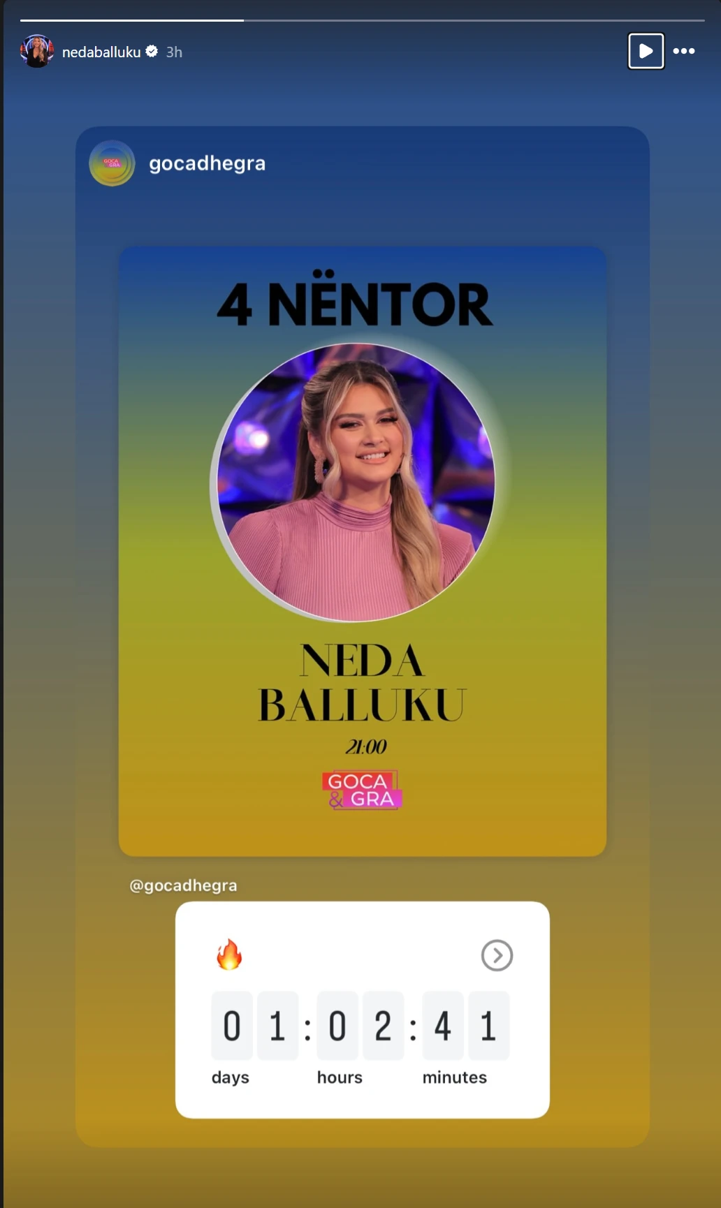 Nje postim ne instagramin e saj, Neda ka njoftuar se diten e neserme nga ora 21:00 do te jete e ftuar ne Goca Dhe Gra