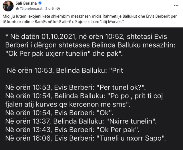 Kreu i Partisë Demokratike Sali Berisha ka publikuar një seri mesazhesh, për të cilat thotë se janë komunikime mes zv.kryeministres Belinda Balluku dhe ish-kreut të ARRSH-së Evis Berberit, pjesë e dosjes së SPAK-ut.
