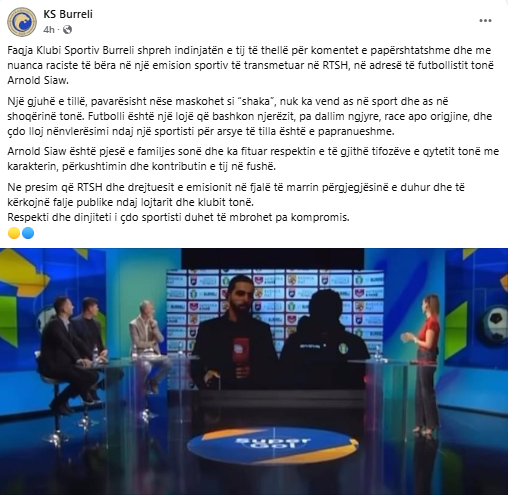 Aq e rëndë u bë situata sa klubi i KF Burrelit u detyrua të reagojë në faqen e vet në Instagram, duke shkruar: “Në një emision televiziv sportiv, u bë një akt i turpshëm bullizmi dhe talljeje ndaj lojtarit tonë Siaw, i cili me profesionalizëm e përulësi po përfaqëson me nder Burrelin.”