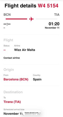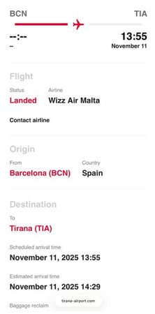 Sipas të dhënave zyrtare të aeroportit, fluturimi nga Barcelona ishte planifikuar të mbërrinte në Tiranë në orën 01:20 të datës 11 nëntor, por u shty për më shumë se 13 orë, duke u ulur në 14:29 të pasdites së së njëjtës ditë.