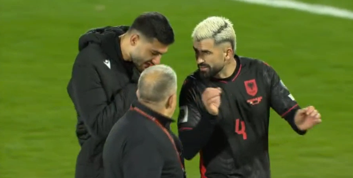 Edhe zëvendëspresidenti i FSHF, Lutfi Nuri, ngushëlloi lojtarin i cili pa dëshirë iu bashkua pjesës tjetër të ekipit për foton, duke shkuar më pas i dëshpëruar drejt dhomave të zhveshjes./PANORAMASPORT.AL