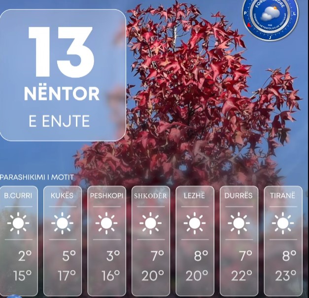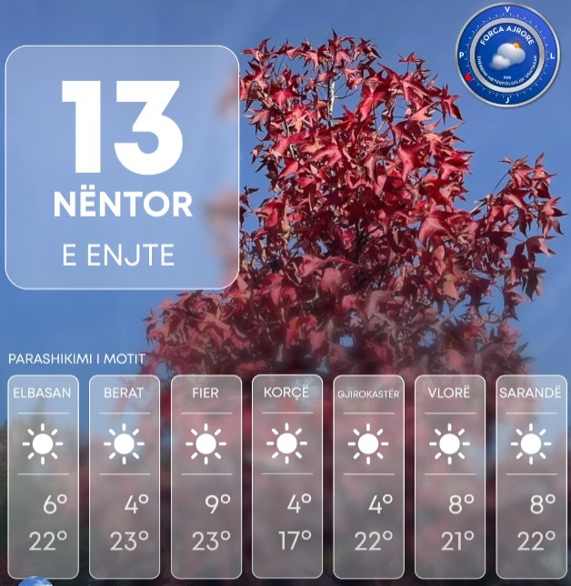 Sipas Shërbimit Meterologjik Ushtarak era do të fryjë me drejtim veriperëndim – verilindje me shpejtësi mesatare 5 m/s, ndërsa përgjatë vijës bregdetare e zonave luginore era fiton shpejtësi 10 m/s.