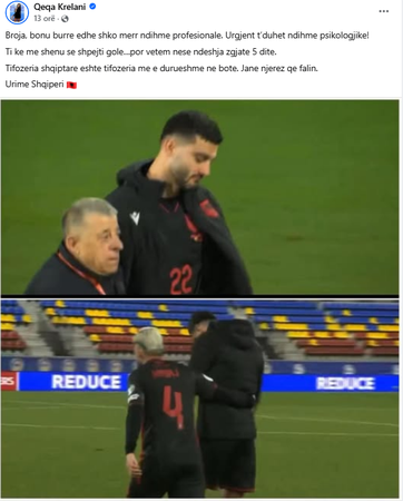 Qeqa Krelani: Broja, bëhu burrë edhe shko merr ndihmë profesionale. Urgjent të duhet ndihë psikologjike! Ti ke për shënuar së shpejti gol…por vetëm nëse ndeshja zgjatë 5 ditë. Tifozeria shqiptare është tifozeria më e durueshme në botë. Janë njerëz qe falin. Urime Shqipëria.