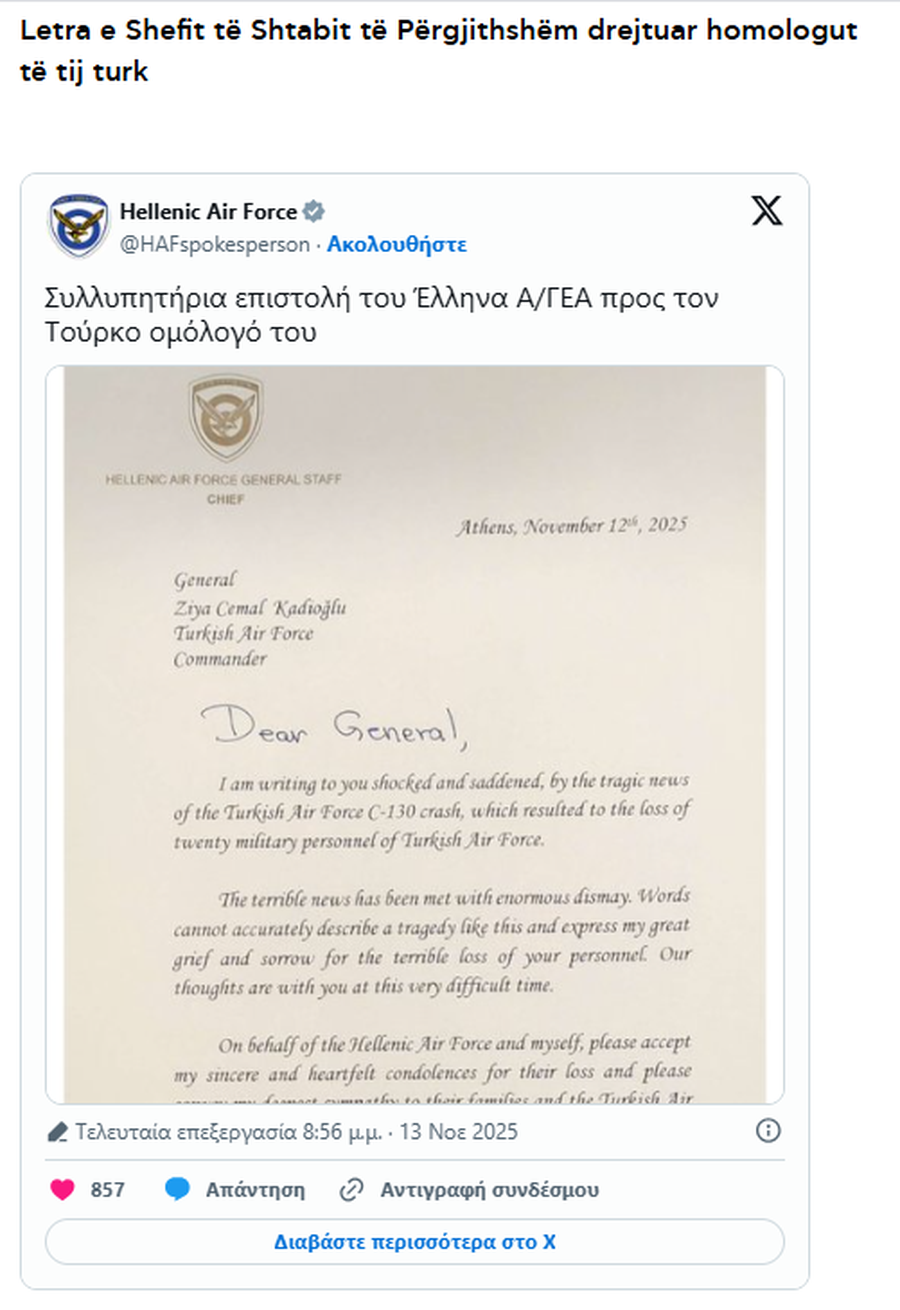 Postimi fillestar nga Forcat Ajrore Helene u bë më 5 nëntor dhe u përsërit më 11 nëntor përpara se të “hiqej” dhe më pas u postua mesazhi i ngushëllimit nga Shefi i Forcave Ajrore Helene drejtuar homologut të tij turk.