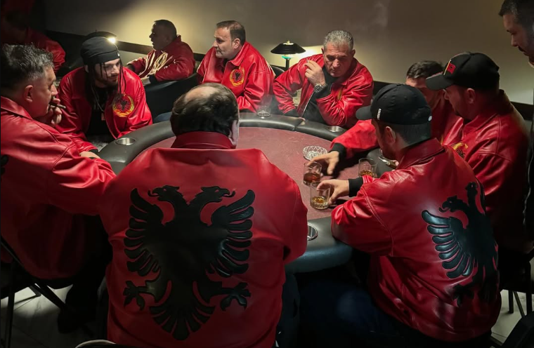 Në këtë foto, një grup burrash janë ulur rreth një tavoline pokeri, të veshur me xhaketa të kuqe që mbajnë shqiponjën dykrenare, simbol identifikues i Shqipërisë.
