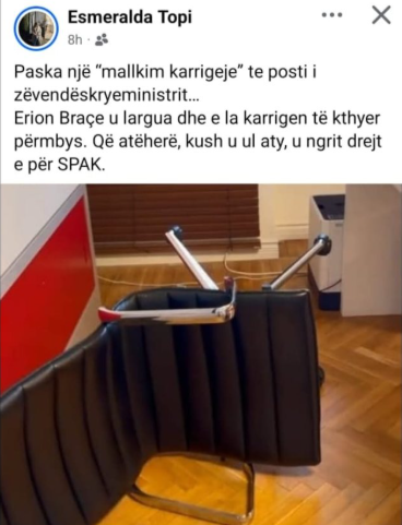 Gazetarja Esmeralda Topi ka publikuar një foto të karriges së zv/kryeministres Belinda Balluku, duke shkruar se kur u largua Erion Braçe nga posti i numrit dy të qeverisë, la karrigen të kthyer përmbys.
