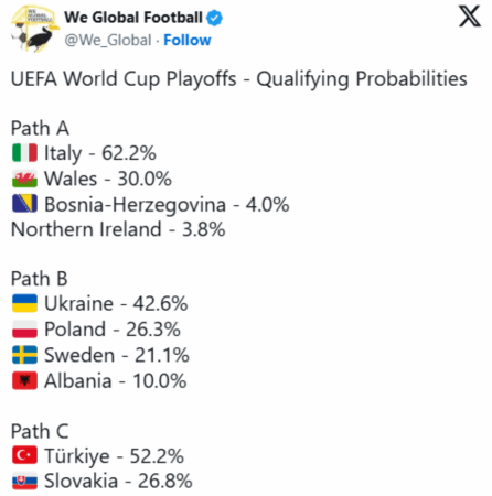 “We Global Football” ka bërë parashikimet për skuadrat që do të luajnë në Play off-in e Botërorit.