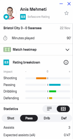 Futbollisti shqiptar luajti të plotë ndeshjen me Swansea që Bristol City e fitoi me rezultatin 3-0. Anis Mehmeti nuk shënoi asnjë gol në këtë përballje, por ai i la gjurmët e tij, pasi ai dha asiste te të 3 këto gola.