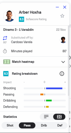 Ndërsa Arbër Hoxha u vlerësua me notën 8.3 për paraqitjen e tij në sfidën mes Dinamos së Zagrebit dhe Varazdin ku ai shënoi dy gola. Arbër Hoxha u zëvendësua në minutën e 80, por në ndeshjen me Varazdin, përvec dy golave ai kreu edhe 4 driblime si dhe fitoi 5 duele