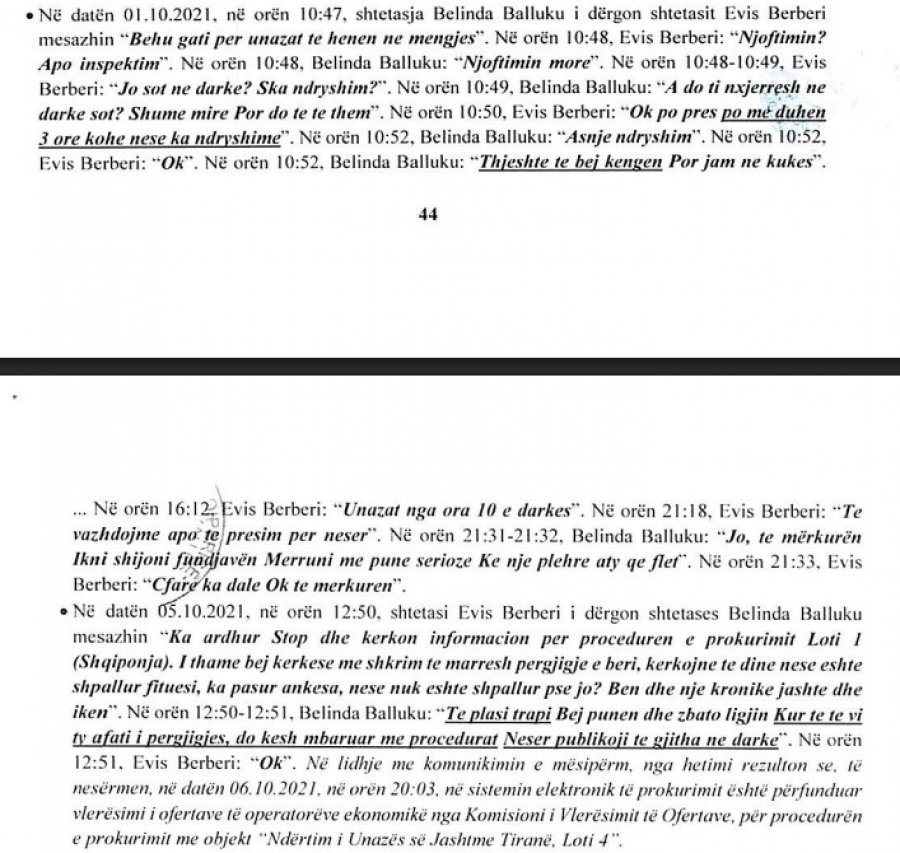 Në datën 05.10.2021, në orën 12:50, shtetasi Evis Berberi i dërgon shtetases Belinda Balluku mesazhin “Ka ardhur Stop dhe kërkon informacion për procedurën e prokurimit Loti 1 (Shqiponja). I thamë bëj kërkesë me shkrim të marrësh përgjigje e beri, kërkojnë të dinë nëse është shpallur fituesi, ka pasur ankesa, nëse nuk është shpallur pse jo? Bënë dhe një kronike jashtë dhe ikën”. Në orën 12:50-12:51, Belinda Balluku: “Të plasi trapi. Bëj punën dhe zbato ligjin. Kur te të vijë ty afati i përgjigjes, do kesh mbaruar me procedurat. Nesër publikoji të gjitha në darkë”./© SYRI.net