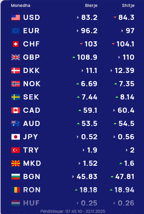 Ndërsa paundi britanik do blihet me 108.9 lekë dhe do shitet me 110 lekë.