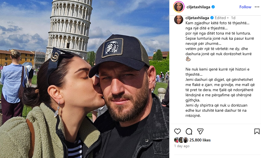 Në rrjetet sociale, këngëtarja publikoi një foto, por të ngarkuar me ndjenjë, e cila u shoqërua me një tekst të gjatë, që tregonte historinë e tyre të dashurisë dhe sfidat që çifti ka përballuar ndër vite.