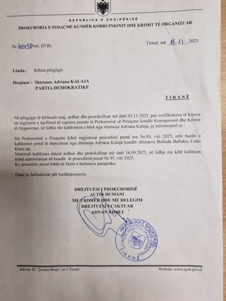 Kujtojmë se avokatja Adriana Kalaja e ka kallëzuar Tërmet Peçin për korrupsion dhe abuzim me tenderat e rindërtimit, duke përmendur një aferë që arrin deri në 66 milionë euro. Gjithashtu edhe padinë ndaj Belinda Ballukut dhe Ceno Klosi e ka përgatitur dhe dorëzuar në SPAK, po Adriana Kalaja.