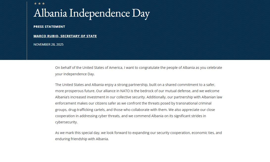 SHBA uron Shqipërinë me rastin e Ditës së Pavarësisë, Marco Rubio: : Vlerësojmë bashkëpunimin tonë të ngushtë