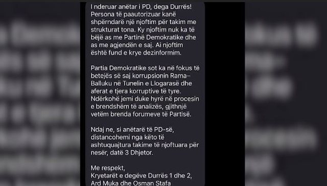Në mesazhin që ka qarkulluar dje dhe sot, dhe që u është dërguar demokratëve nga kryetarët e degëve 1 dhe 2, Ard Muka dhe Osman Stafa, theksohet se “persona të paautorizuar kanë shpërndarë një njoftim për takim me strukturat”, duke e cilësuar këtë si “fund e krye dezinformim”.