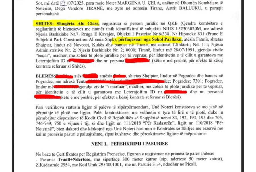 VoxNews ka siguruar dokumente noteriale, ku rezulton se ajo pasuri është shitur në muajin korrik të vitit 2025, nga kompania e Sokol Përllakut te I.L. Kujtojmë se, Sokol Përllaku ka bashkëpunuar shumë ngushtë me nënën e Daniel Shimës, në blerjen dhe shitjen e një kompanie që xhiroi prona me vlerë miliona euro.