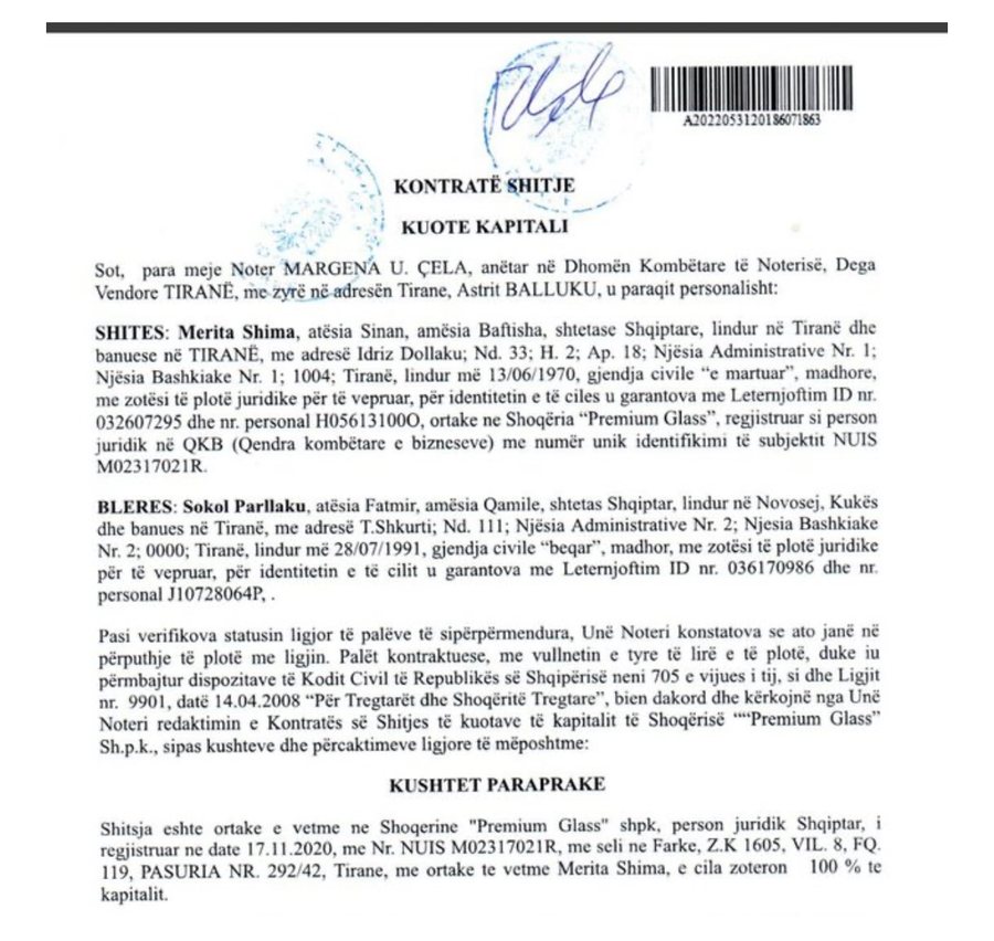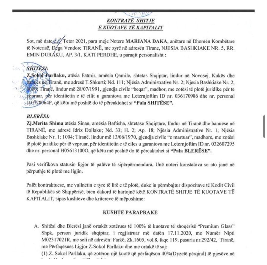 Daniel Shima ka pasur informacione se veprimtaria e tij dhe e nënës rrobaqepëse po hetohej. Në fund të vitit 2022, ai ka “urdhëruar” nënën e tij, Meritën, që t’ia kthejë aksionet Sokol Përllakut, të njëjtit person që ia bleu. Nëse çmimi i blerjes ishte 400 euro, çmimi i shitjes nga Merita te Sokoli shkoi në vetëm 1000 euro.