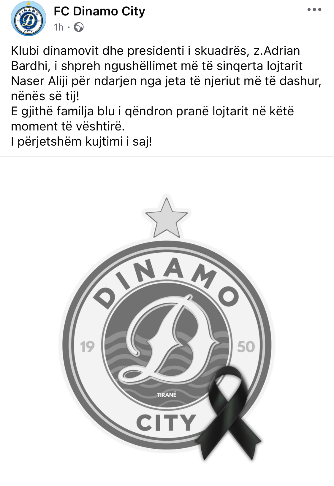 “Klubi dinamovit dhe presidenti i skuadrës, z.Adrian Bardhi, i shpreh ngushëllimet më të sinqerta lojtarit Naser Aliji për ndarjen nga jeta të njeriut më të dashur, nënës së tij!